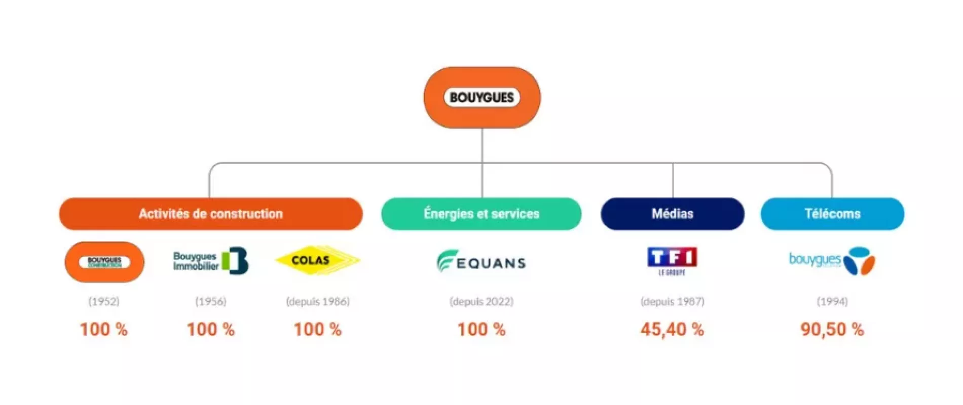 Bouygues est un groupe de services diversifié, présent dans quatre activités et composé de six métiers : Bouygues Construction, Bouygues Immobilier, Colas, Equans, TF1 et Bouygues Telecom.